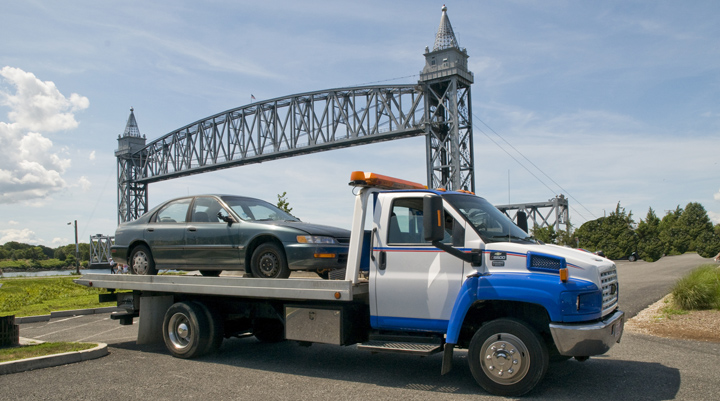 No. Towing is free. We can accept cars that do not run or even do not have tires because we can carry them on our ramp truck. (See photo above.)